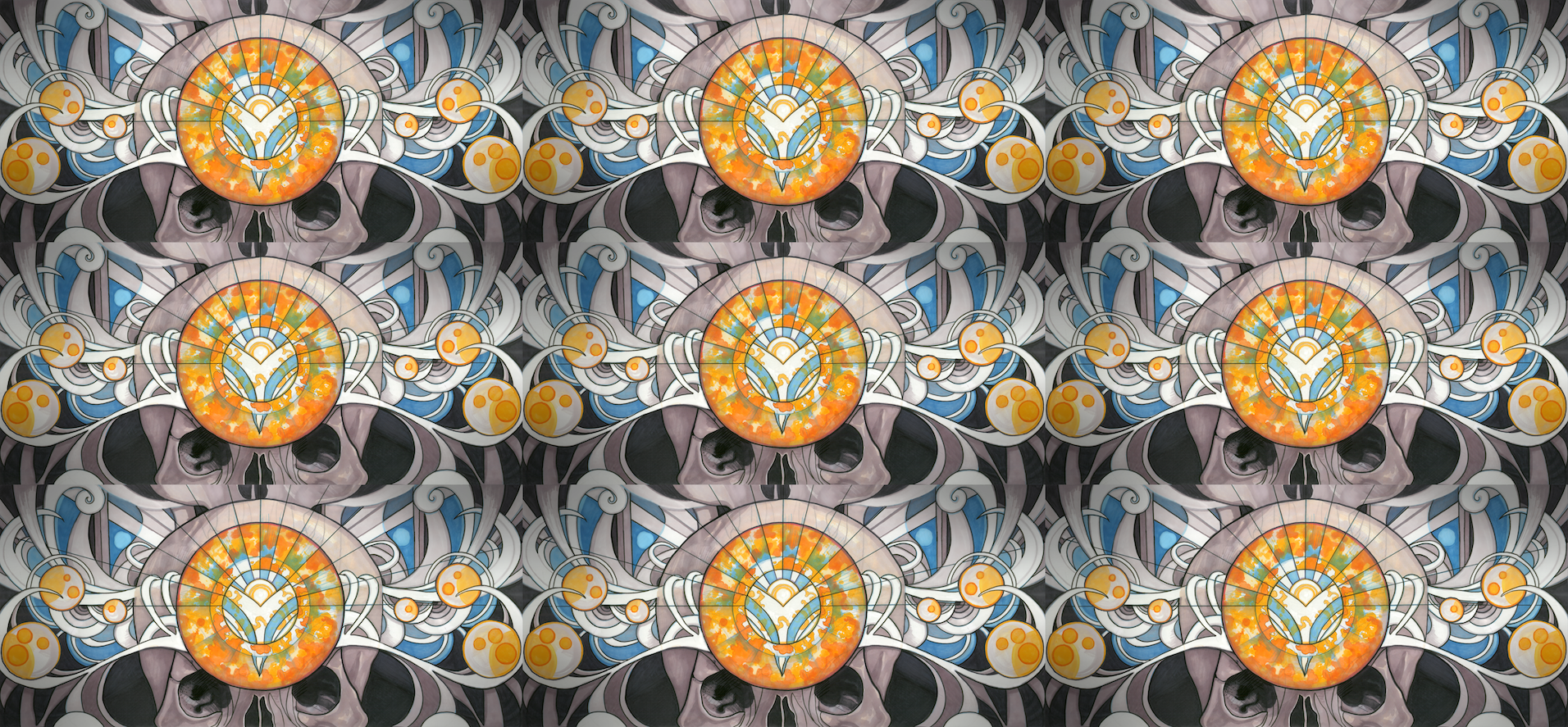 The more conceptual part of the work forms a loose pattern when combined with copies of itself. One image evokes individual experience and mortality, while the pattern left to be discovered evokes interconnections across experience with no real beginning or end.